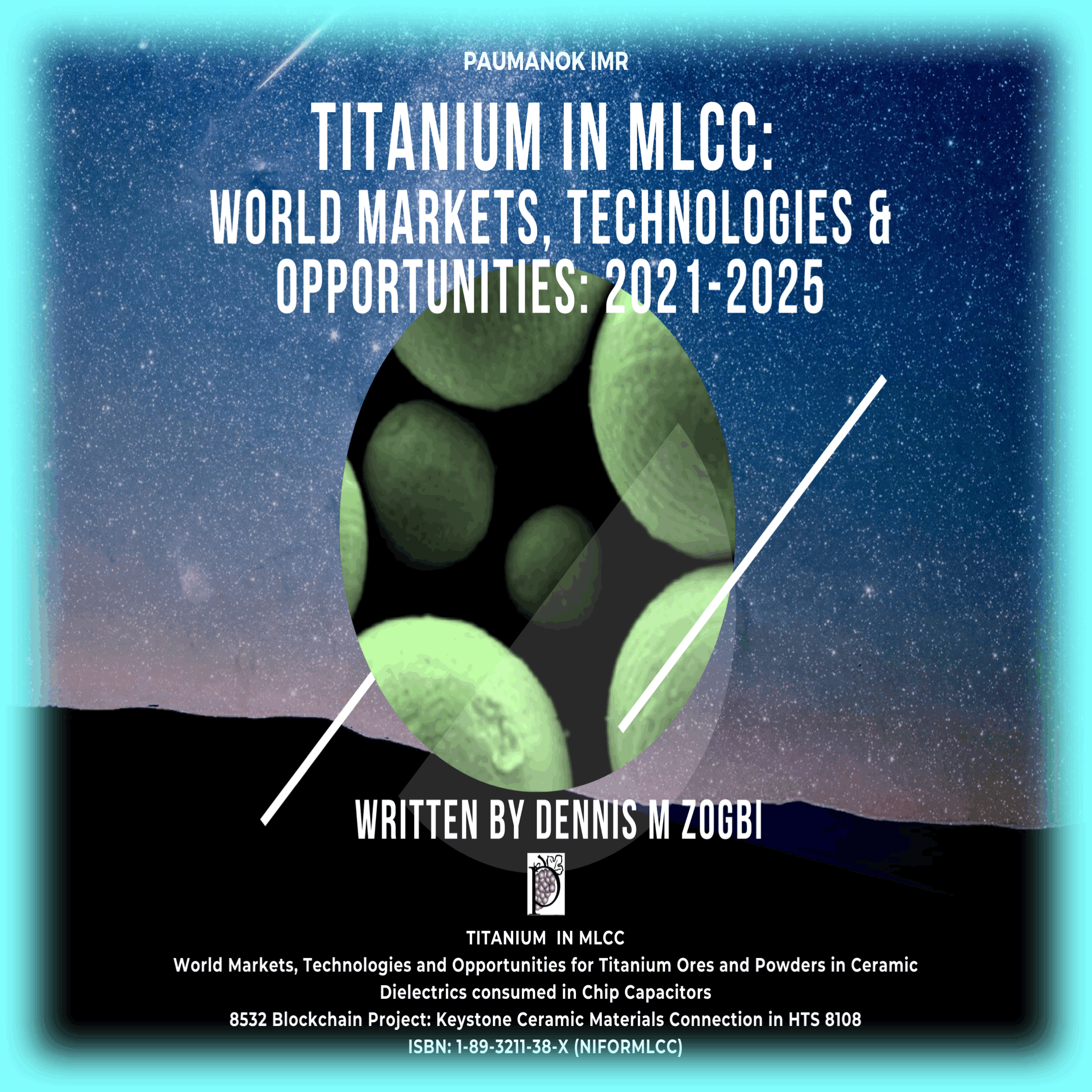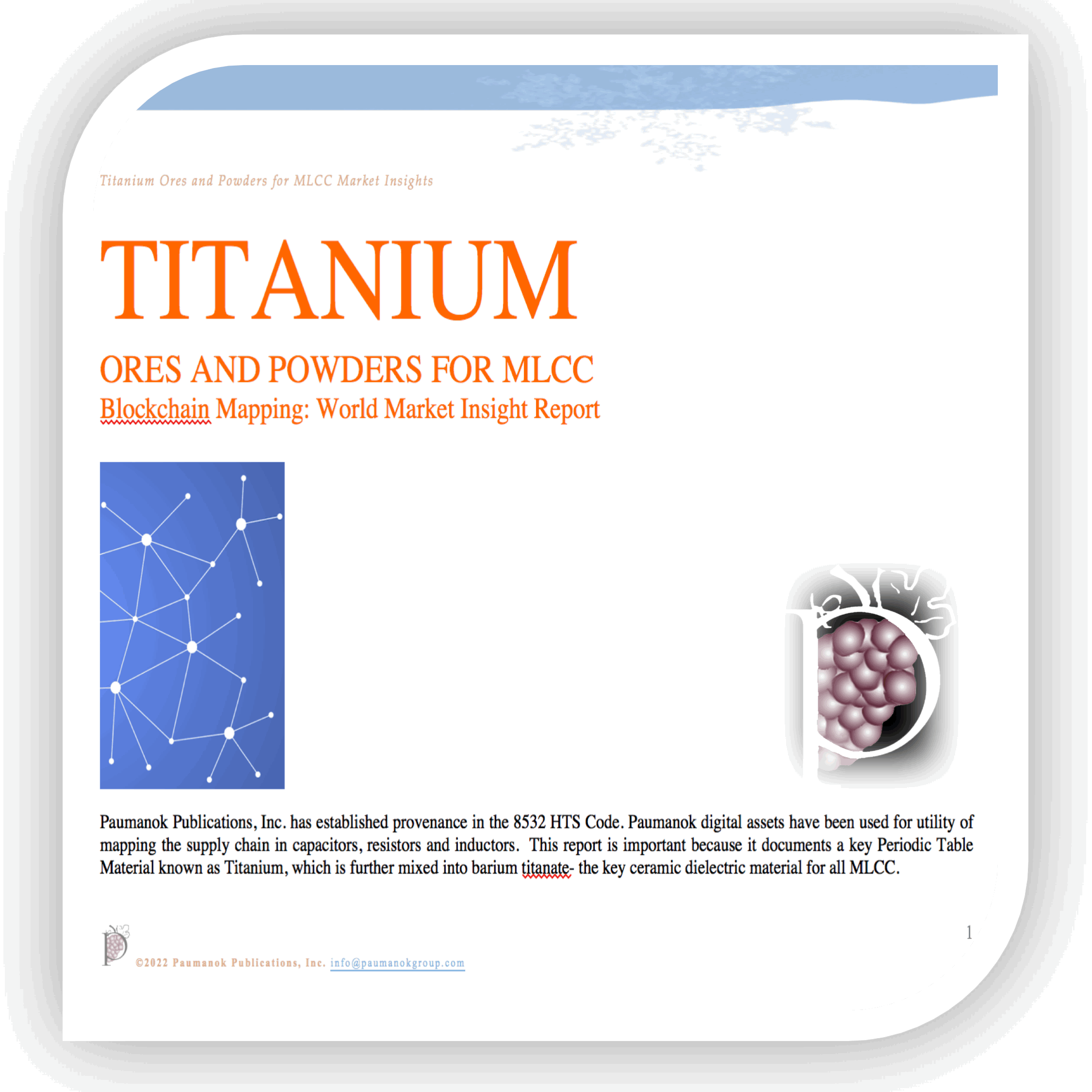 This report focuses specifically on consumption value, volume and pricing for Titanium (Ti- Element 22) consumed as an fundamental keystone material to make ceramic dielectric materials used in multilayered ceramic chip capacitors. The report uses provenance of the publisher to establish the connection between the HTS 8532 and 8108 codes for blockchain purposes. The relationship between titanium and capacitors has been well documented for 70 years in “mass-produced” ceramic capacitor technology. This report creates a blockchain pathway that establishes titanium as a keystone material for MLCC production worldwide and identifies the key suppliers and their market shares and locations.